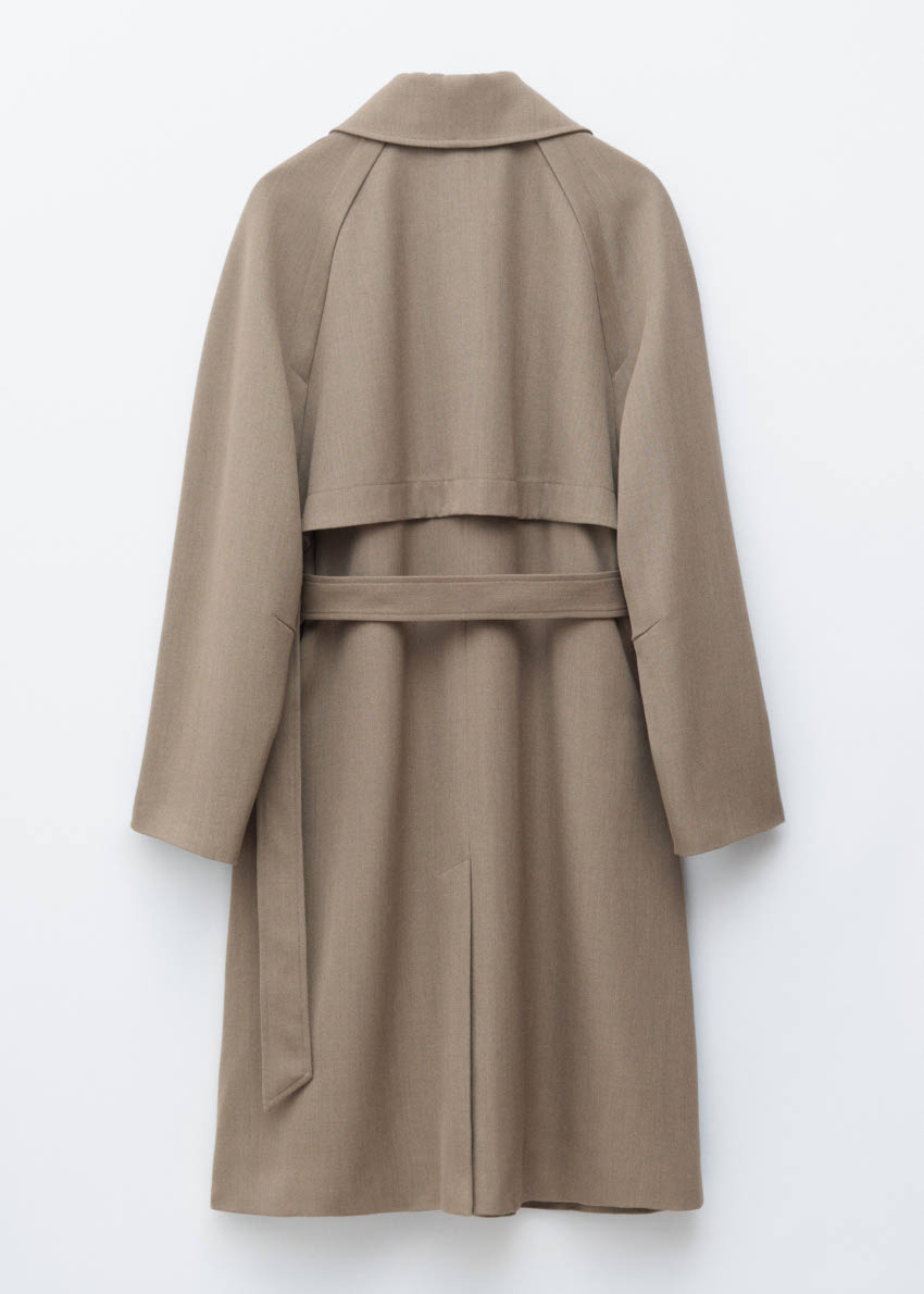 울 혼방 소재로 탄생한 미디 트렌치 코트예요.