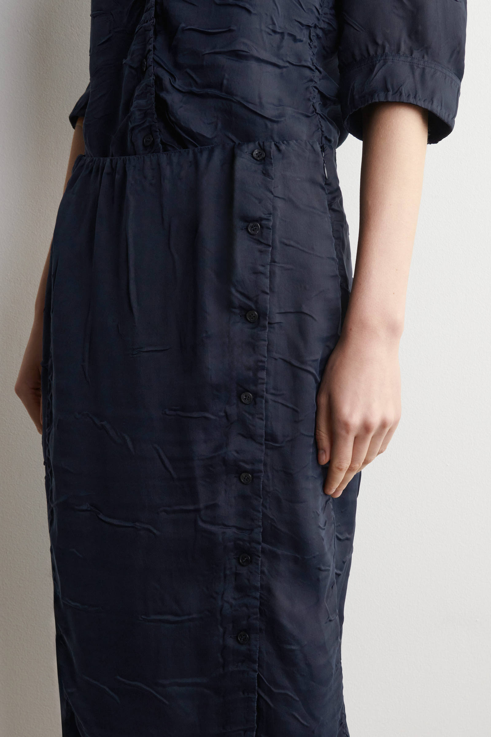 크링클드 효과로 독특한 질감을 연출한 미디 스커트로,
